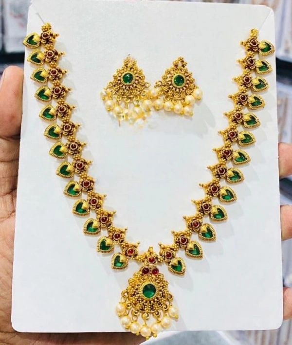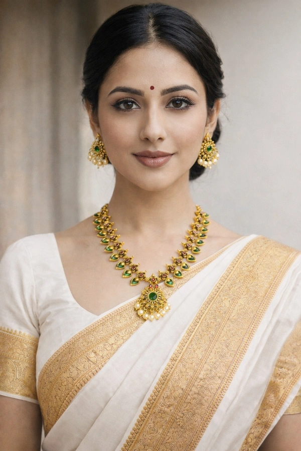 Adorned with classic green palakka motifs and rich red stone accents, this traditional Kerala necklace set is a timeless tribute to heritage elegance.