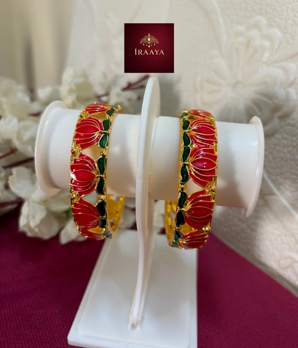 The timeless lotus, crafted in rich red enamel and antique gold, meets regal elegance in our PadmaRani Lotus Bangles.